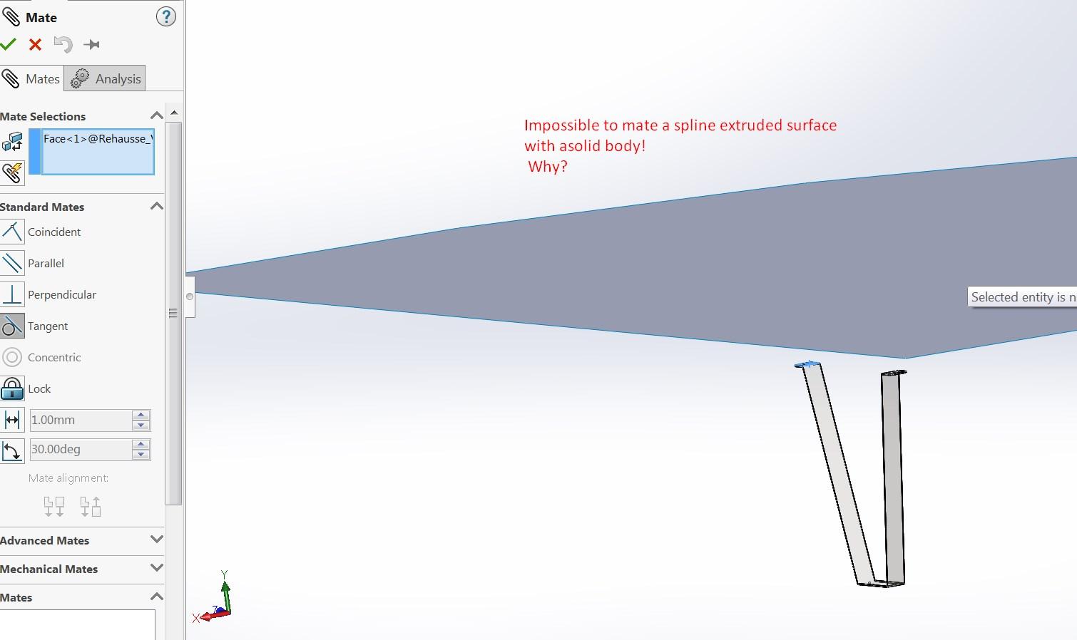 Tangent mate between surface and solid body failed. lololamoto 6 Sep, 2020 09:32 PM Hello, I need to apply a tangent mate between an extruded spline surface and a solid body, but it failed. How can I overpassed such limitation? Thanks SW Mate error.jpg Accepted answer J. Riend Answered on 7 Sep, 2020 01:46 AM You can mate the surface spline sketch tangent to the solid parts surface. Tangent Spline Sketch.PNG 0 Other answers
