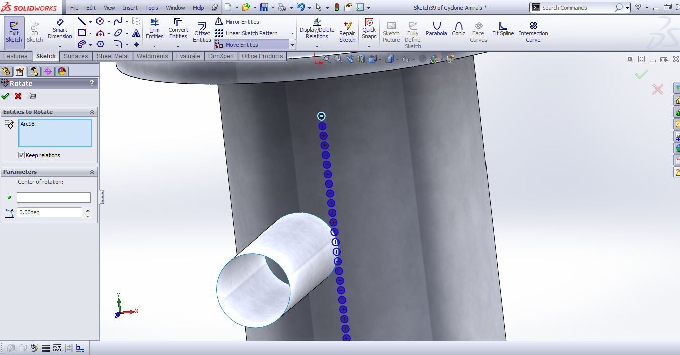 Hi, here's another beginner's question. For example, if I sketched a series of circles along a line (linear Pattern) on a face of lets say a rectangular block, and then I notice I made a mistake and I want the circles to be at the face 90 deg from the face I started.