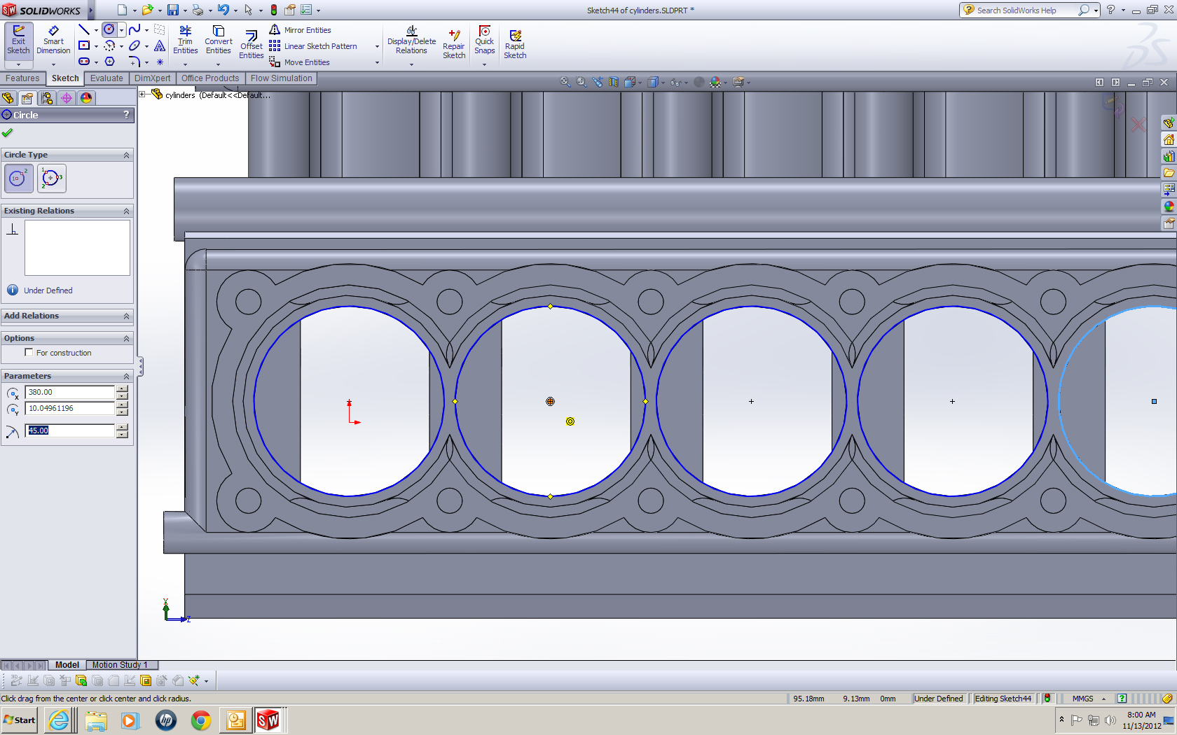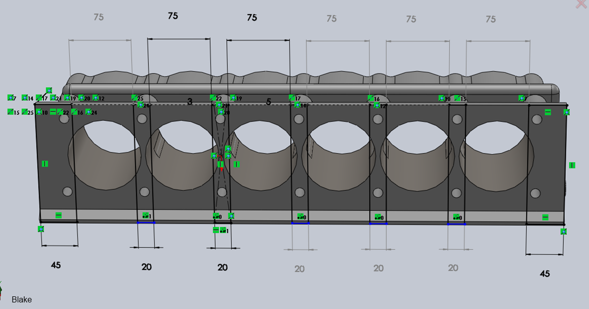 Draw all 12 holes like the ones you see in my screenshot and then extrude/cut them to a depth of 160mm from the top of the pistons. Hope this helps you out!!