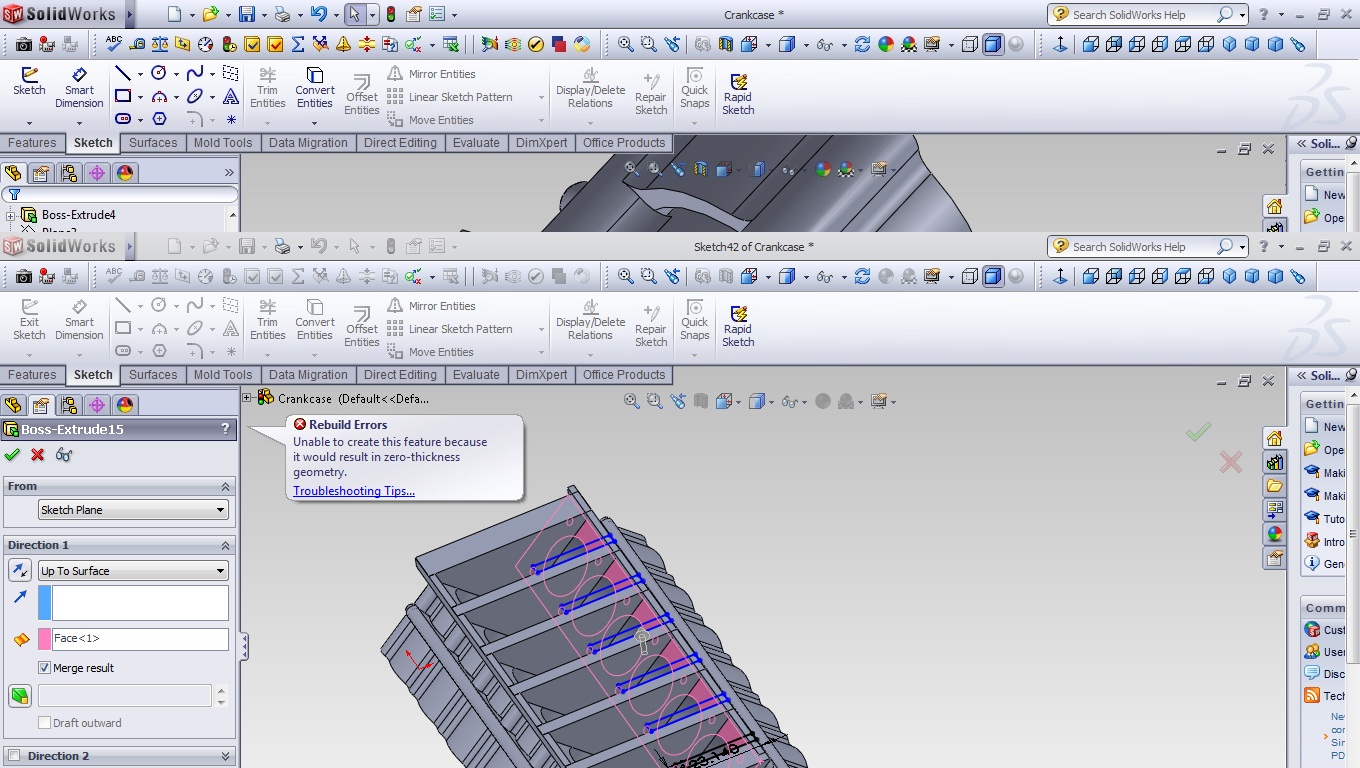 I'm having trouble with step 9. I go to extrude and I'm getting an error "unable to create this feature because it would result in zero-thickness geometry". I think it's something to do with direction 2 because I can get it to extrude to the body just fine but it wont extrude to the surface. Any help would be greatly appreciated. Thanks!