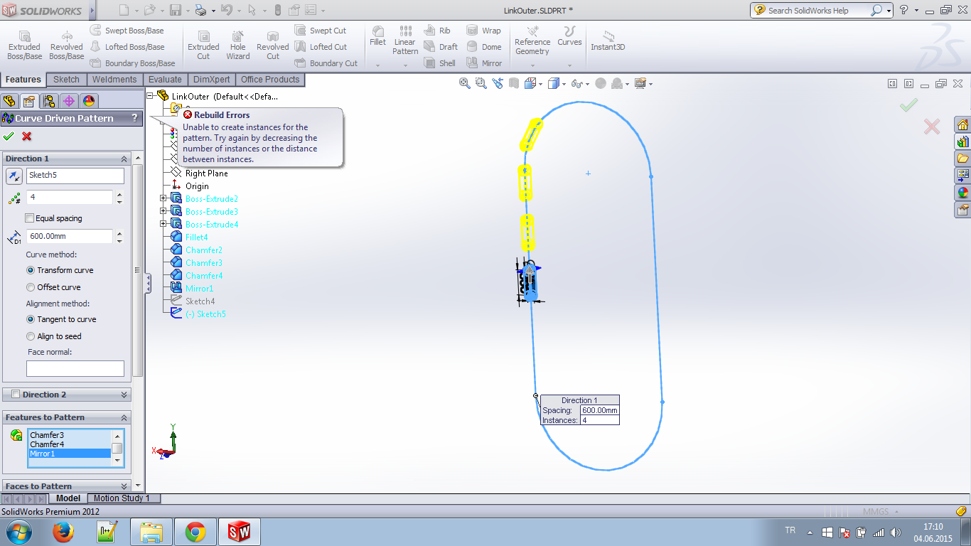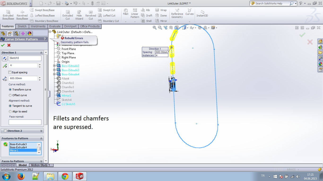 I am trying to make a single part chain with 'curve driven pattern' on Solidworks.