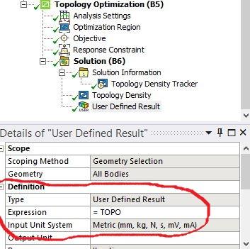 User defines result "TOPO" in ANSYS Workbench ? Huzaifah 12 Jul, 2020 02:13 PM What is purpose of user defined result (=TOPO) in topology optimization solution. Is it density map or something else ? TOPO.JPG