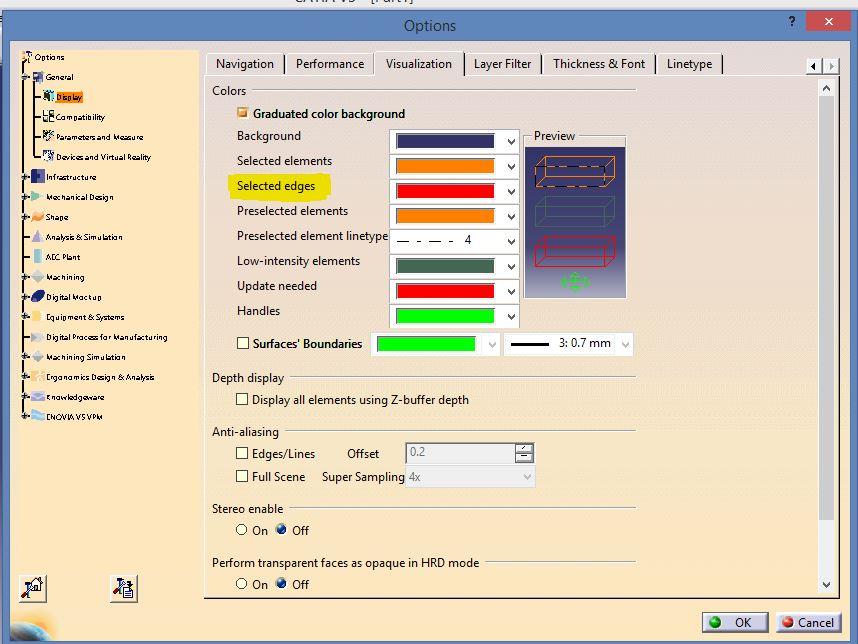 3. [Ref 3.JPG] In case if you wish to change color of selected edges or any surface etc., go to Tools > Options > General > Display > Visualization.