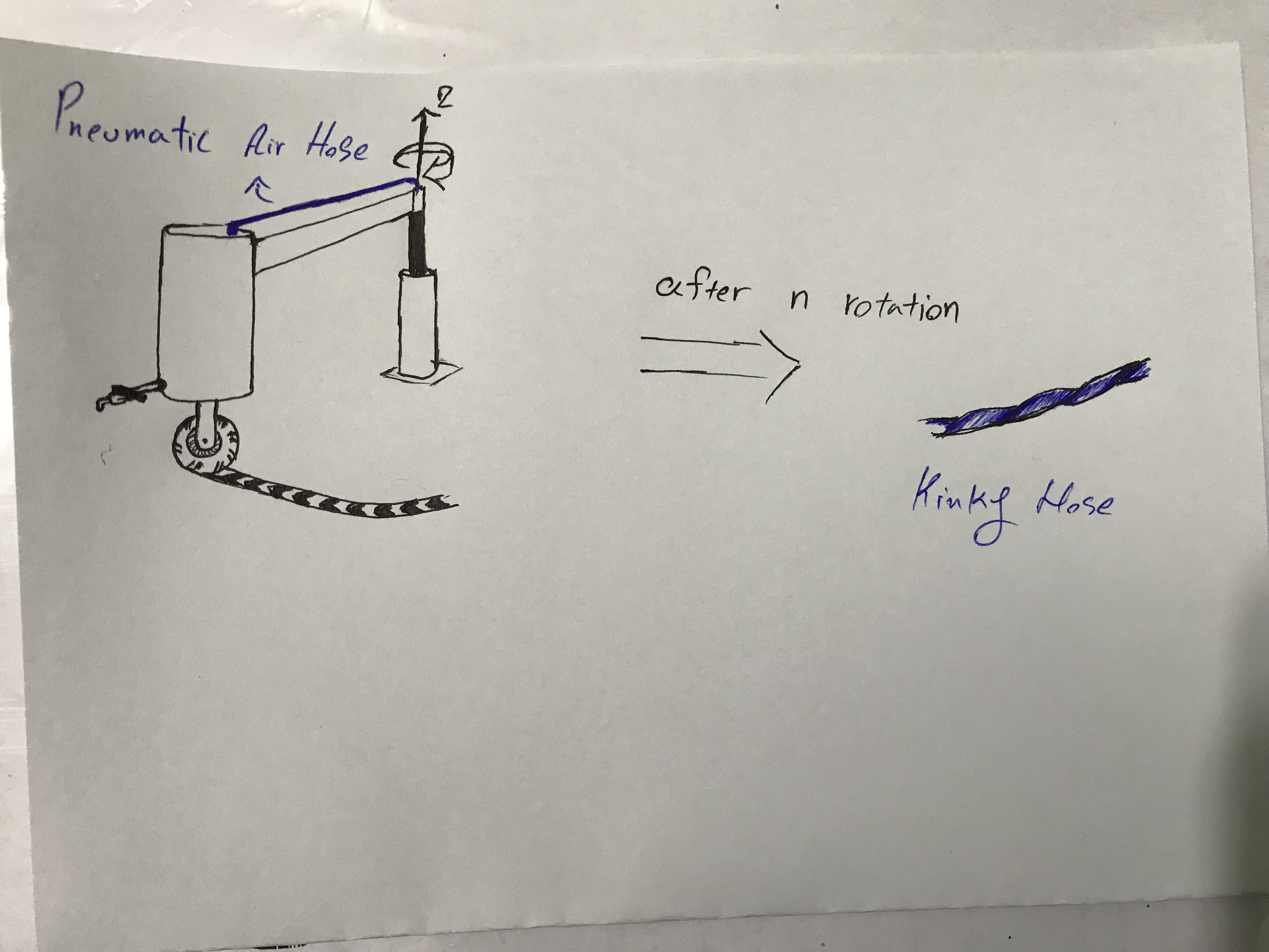 The modern world of engineering continues to surprise me. Engineering professionals needing a computer generated simulation to work out such a simple problem, adequately laid out in attached sketch. Without a swivel fitting of set up shown in sketch, hose will become twisted, this is not that hard to see from this sketch. To solve problem purchasing an off the shelf part from a manufacturer of pneumatic fittings the most sensible solution, though if cost does not matter you could design and build your own swivel fitting if you so desire. If even the simplest of problems requires a computer generated simulation to give us any hope of solving it, humanity is doomed. All those clever machines and structures built by human civilizations need computer simulations ?. Did aliens come down to earth, and we borrow their computers to come up with all this past technology ?. I do not think so. Computers are a tool, just like a spanner, screwdriver, hammer along with many other items used by engineers. Before any tool is useful, thinking, using our brain is where we start.