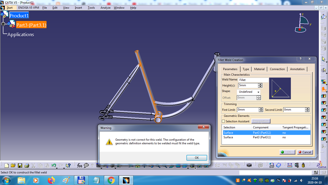 Hi, I created a bicycle frame in Catia and now I'd like to create welds beetwen each pipe. When I try do it in Weld Design I can't select pipes or get information that geometry is not correct to weld. So what should I do to create these welds?