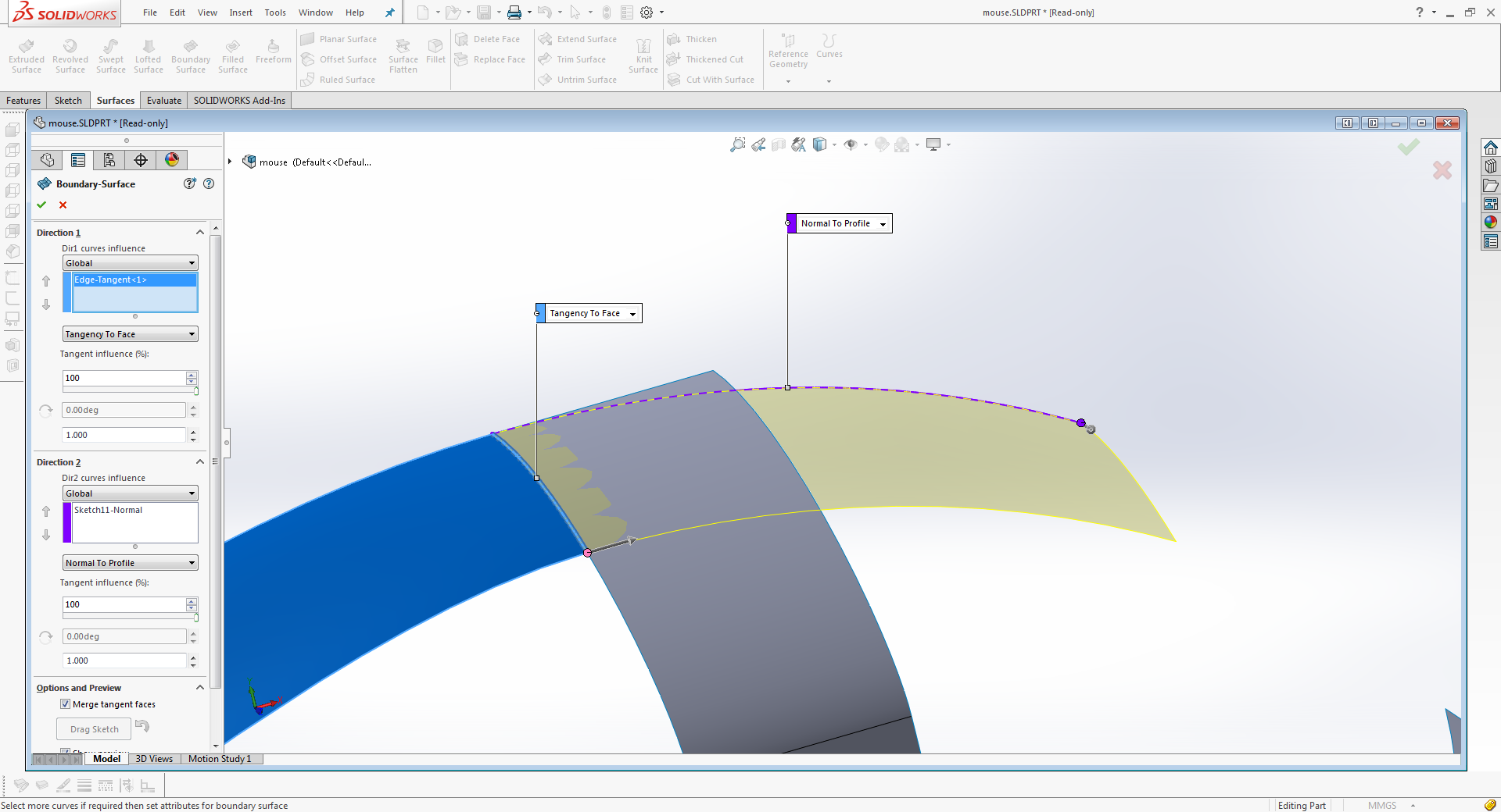 I am trying to make a boundary surface following this youtube tutorial. Below I have attached a gif on imgur of me attempting to create the surface and what the surface is supposed to look like (from the video tutorial)