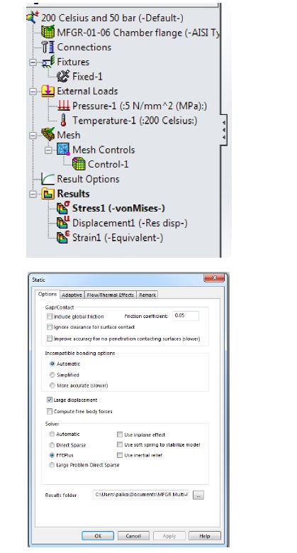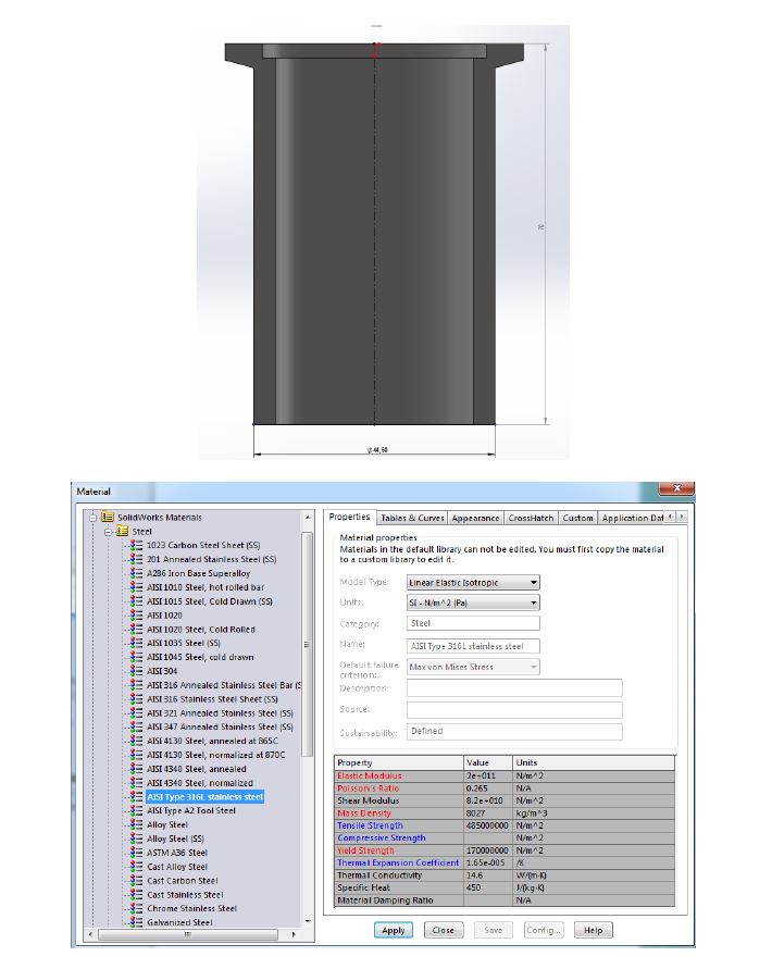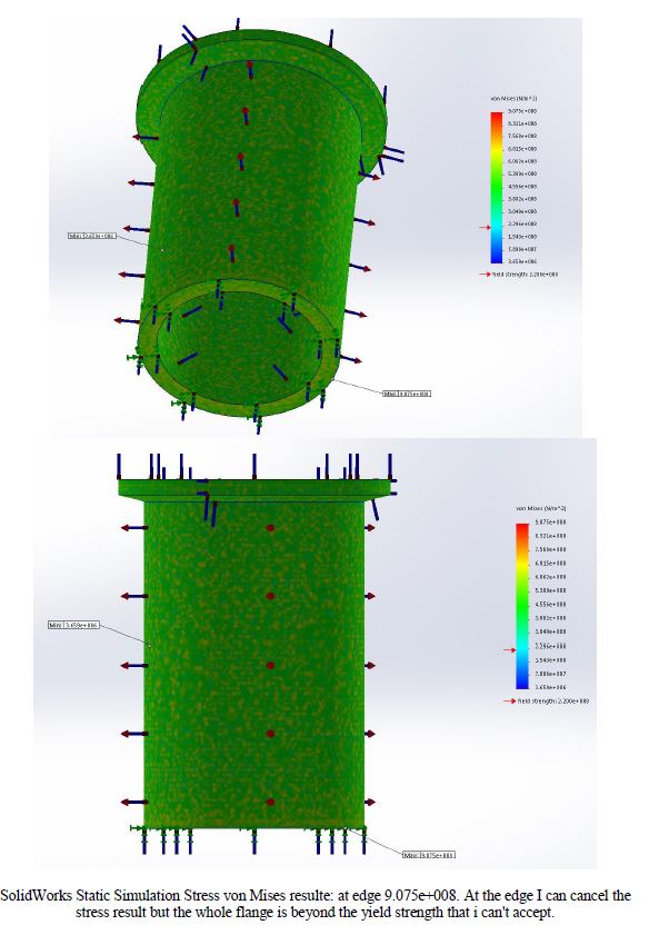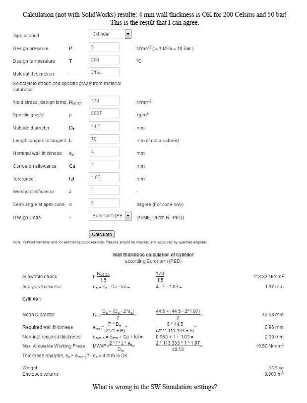 200 Celsius and 50 bar (5 MPa) pressure. The material is 316L. According to the 2014 SolidWorks static simulation (even 2015 SW) the 4 mm wall thickness is not enough. That is not correct. According to the classic calculation is enough. The simulation setting was Large displacement, but other settings had the same result. I am helpless what did i wrong that i can't get result in harmony with the calculation. Do you have any idea?
