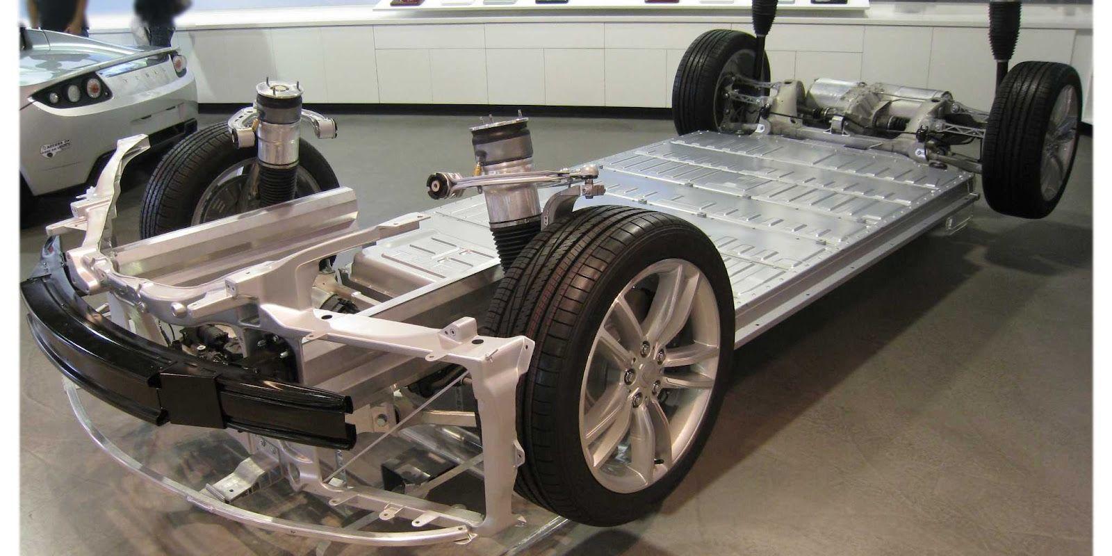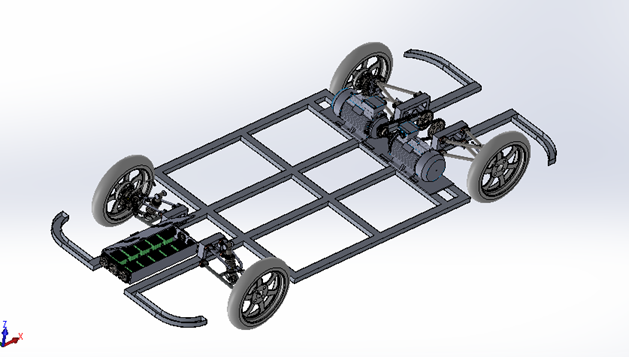 My take on this is it's not a real world design Because 1: battery pack position- Putting batteries in the front crumple zone of a vehicle opens them to being damaged, leading to hazardous materials release and/or fire from a short circuit. Also, batteries are heavy, locating them that far from the CG would greatly reduce handling ( polar inertia). (think FI race car: heavy engine is in the "middle". 2. Looks like the electric motors are industry standard CAD models with chain drive. So I'd guess (and it IS just a guess) this an engineering exercise (or just doodling) for an battery powered electric car. here's a Tessla chassis