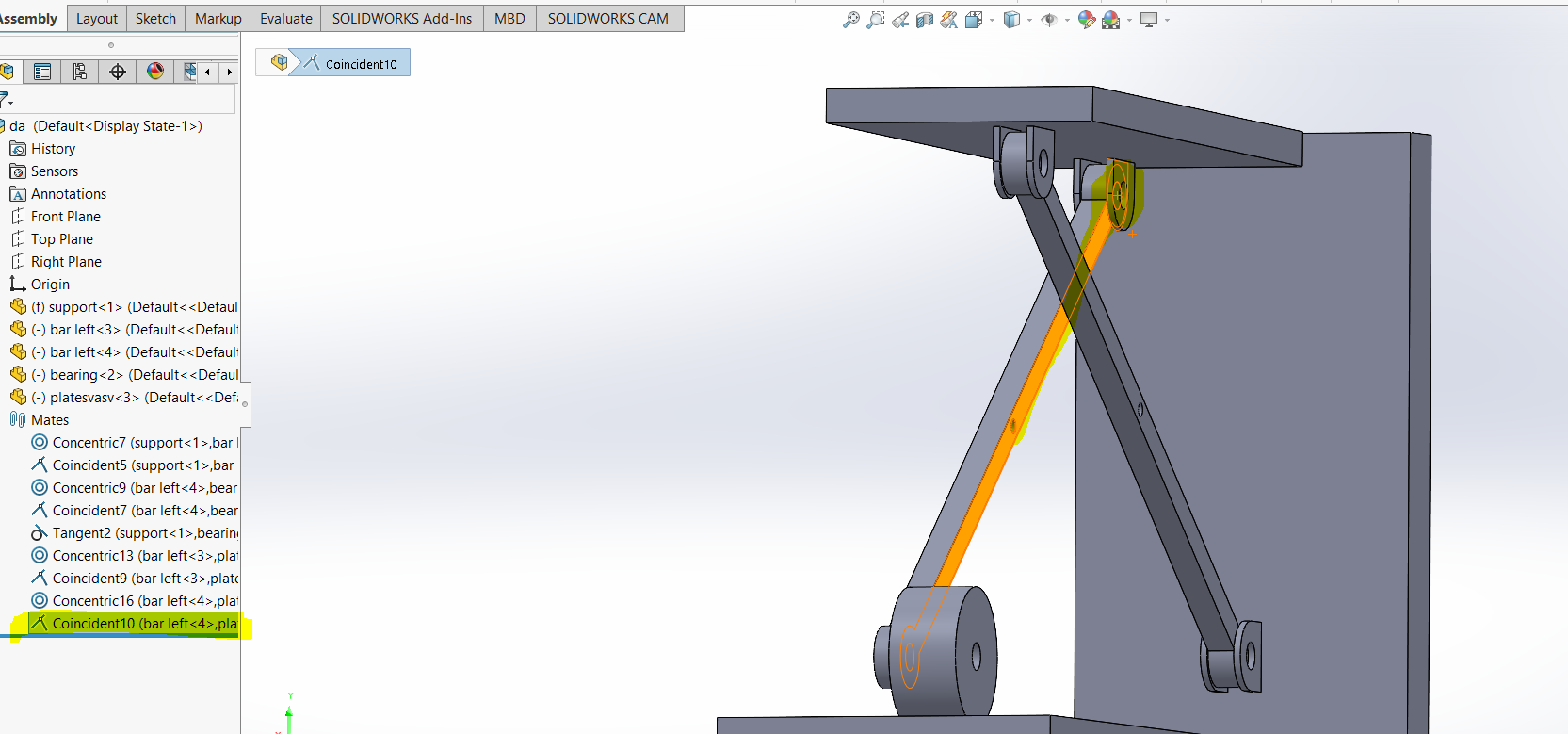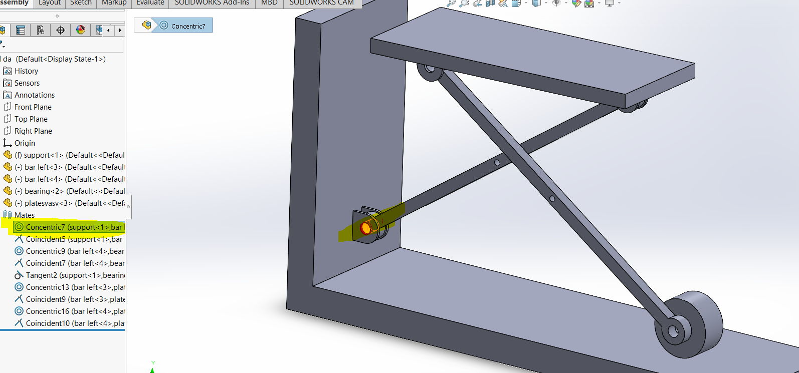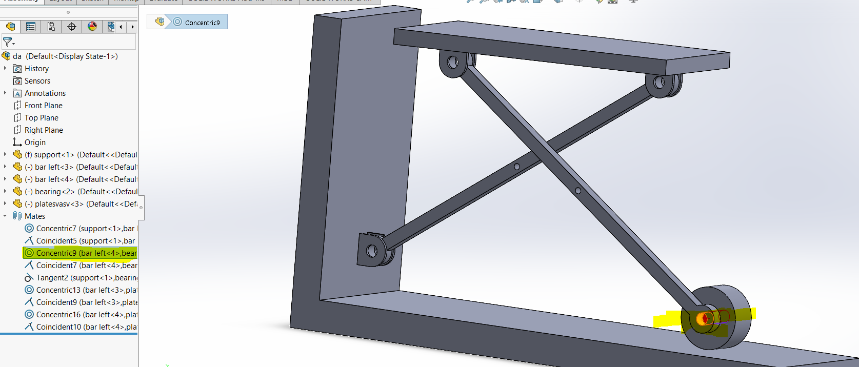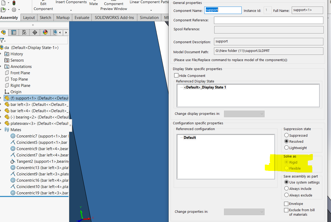 i am doing assembly of this model . everything is perfect .problem is that when i cocentric both holes of bar , as a result the whole assembly gonna fix and can not move . any suggestion please.i have checked components properties and i noticed that my solve as option is disabled all of components and assembly.