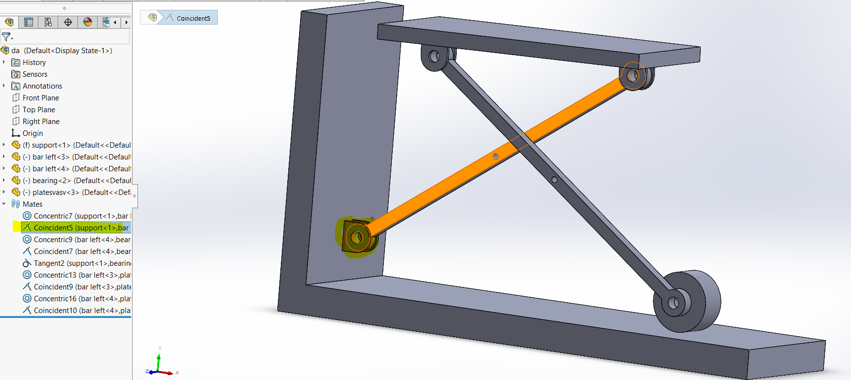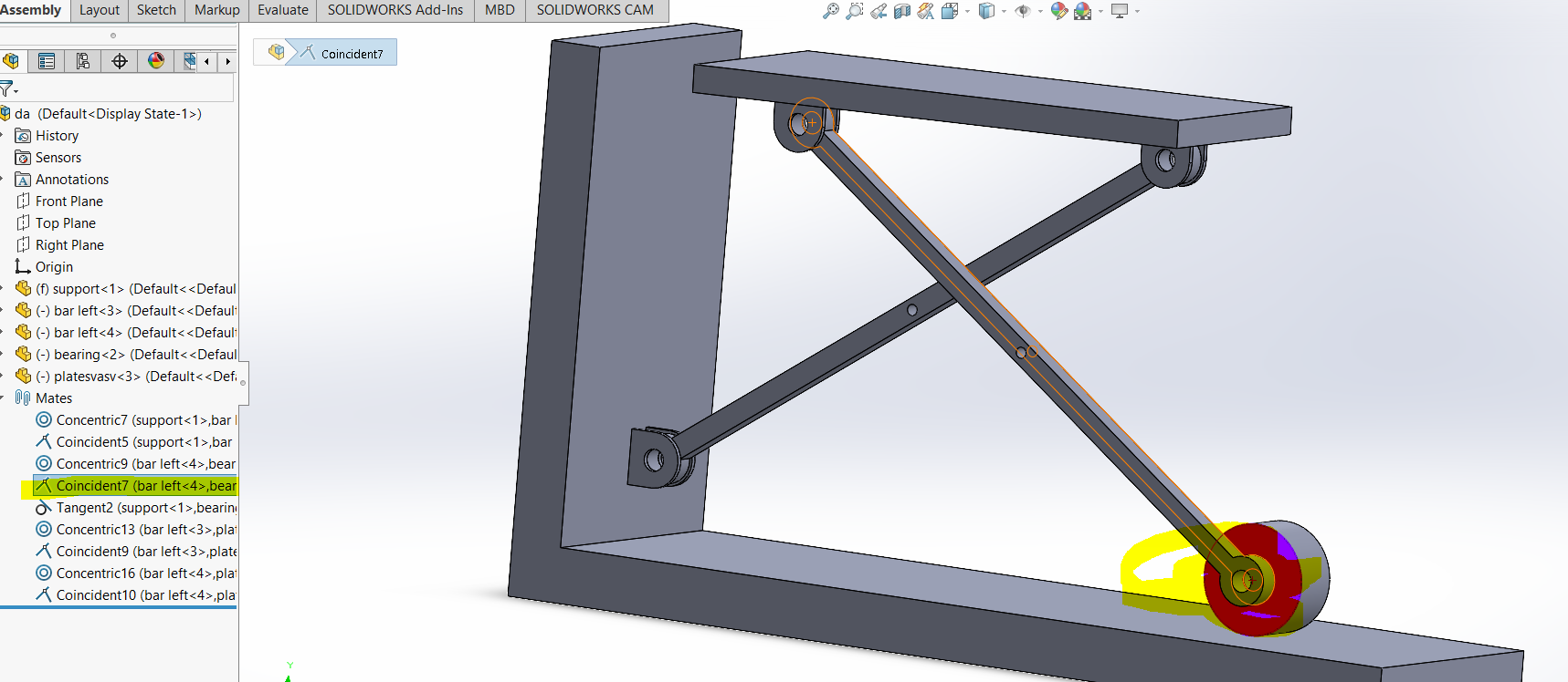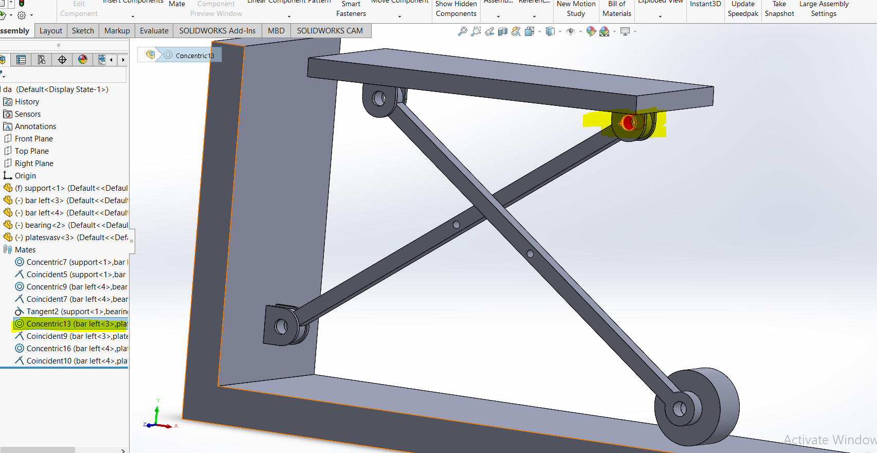 i am doing assembly of this model . everything is perfect .problem is that when i cocentric both holes of bar , as a result the whole assembly gonna fix and can not move . any suggestion please.i have checked components properties and i noticed that my solve as option is disabled all of components and assembly.