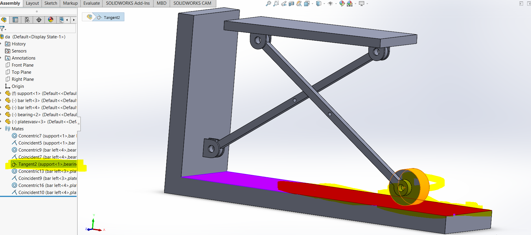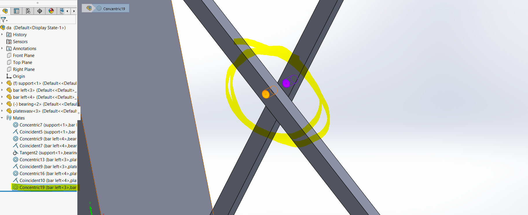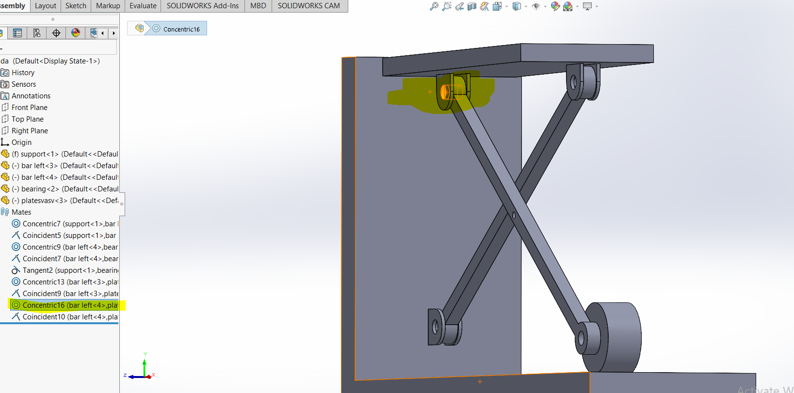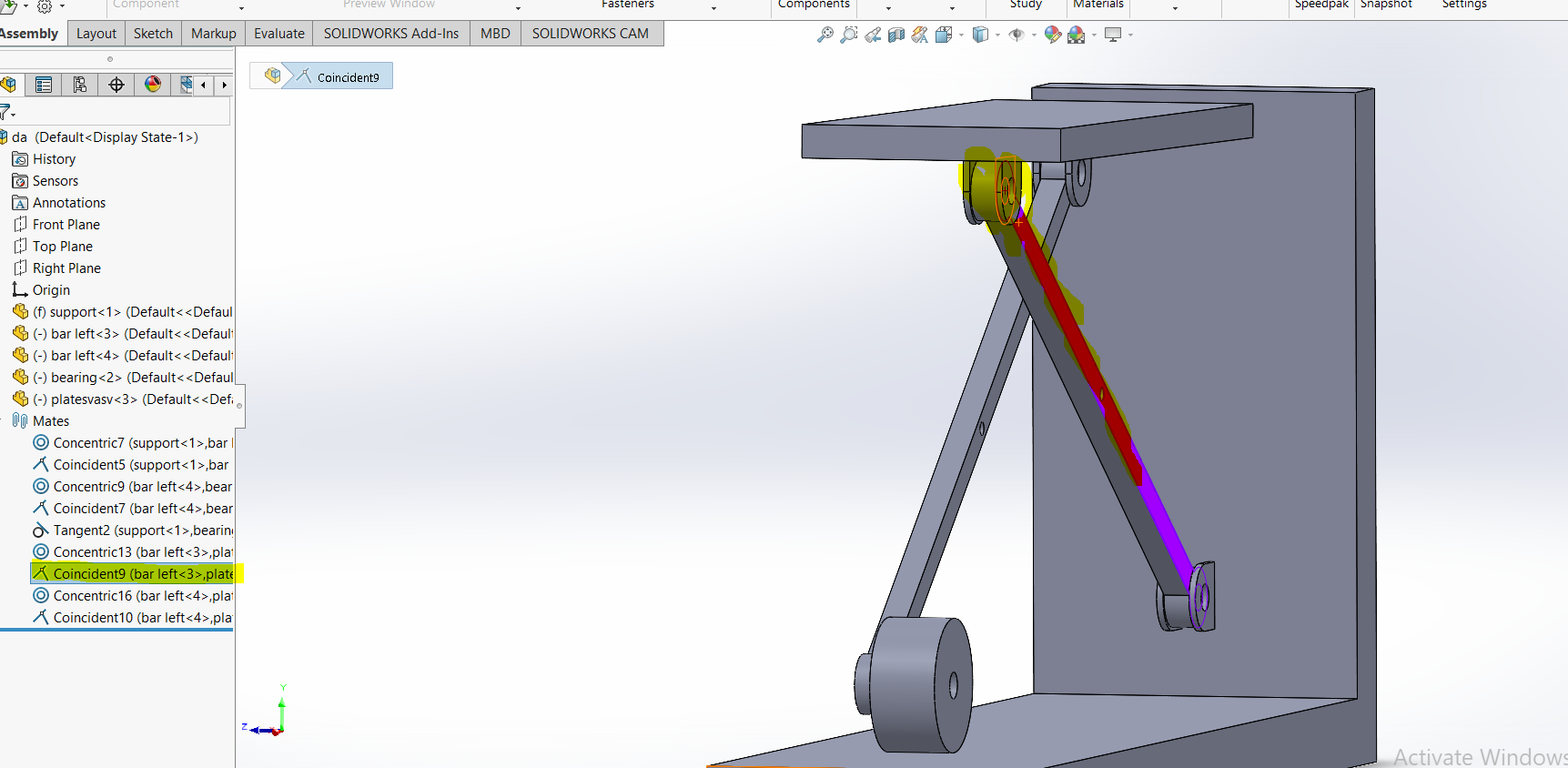i am doing assembly of this model . everything is perfect .problem is that when i cocentric both holes of bar , as a result the whole assembly gonna fix and can not move . any suggestion please.i have checked components properties and i noticed that my solve as option is disabled all of components and assembly.