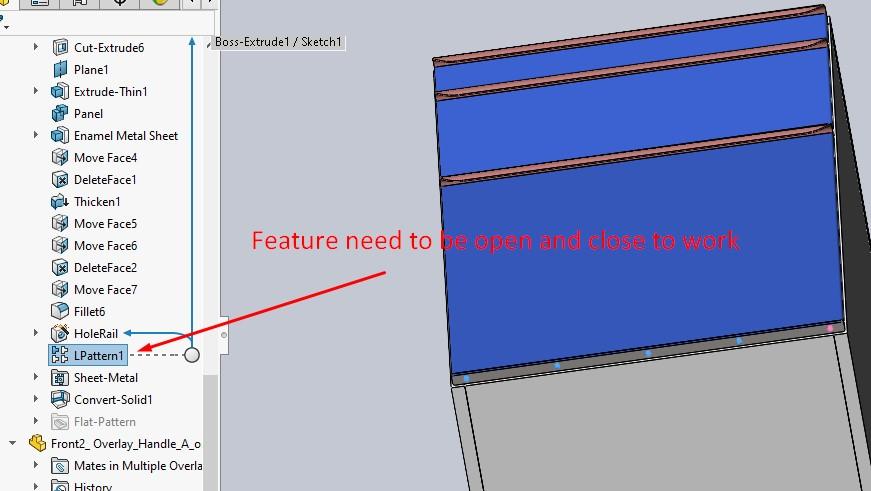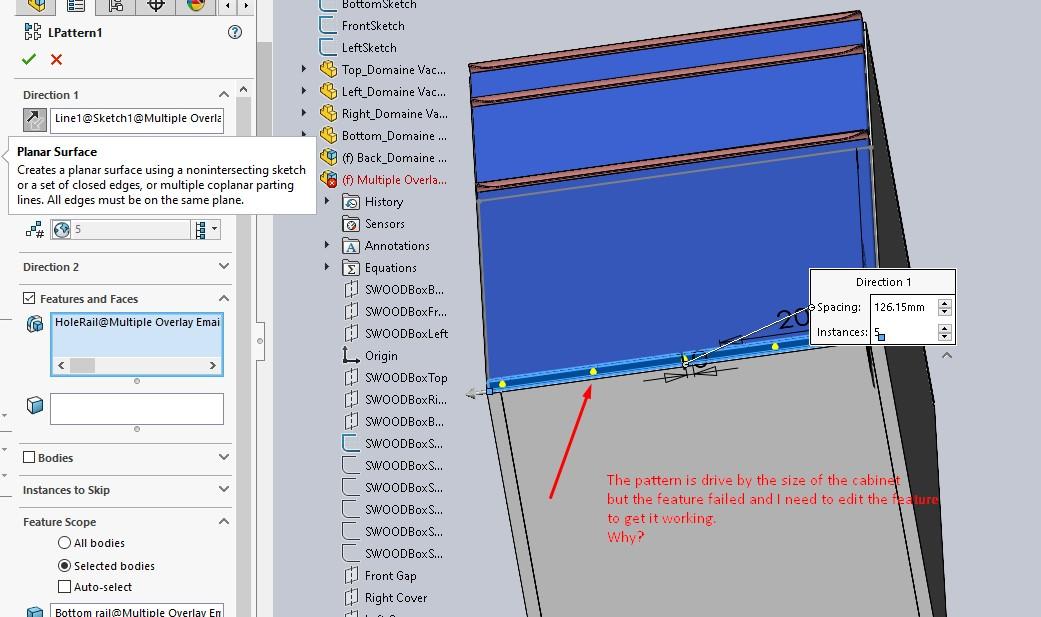 However, the linear pattern failed after changing the carcasse size, but as soon as the feature is edited, it works without touching anything (just open and close the feature).