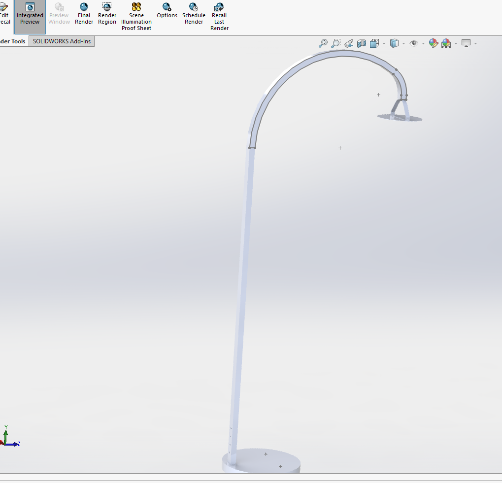 I assume the way I drew it created this? I drew the lamp rod first, then in the front plane I drew the arcs (circles) and extruded. This is the only way I know how to draw two different radii. I am more familiar with AutoCAD than SW. I actually drew it in AC first to get my arc length because I cannot measure the radii lengths.
