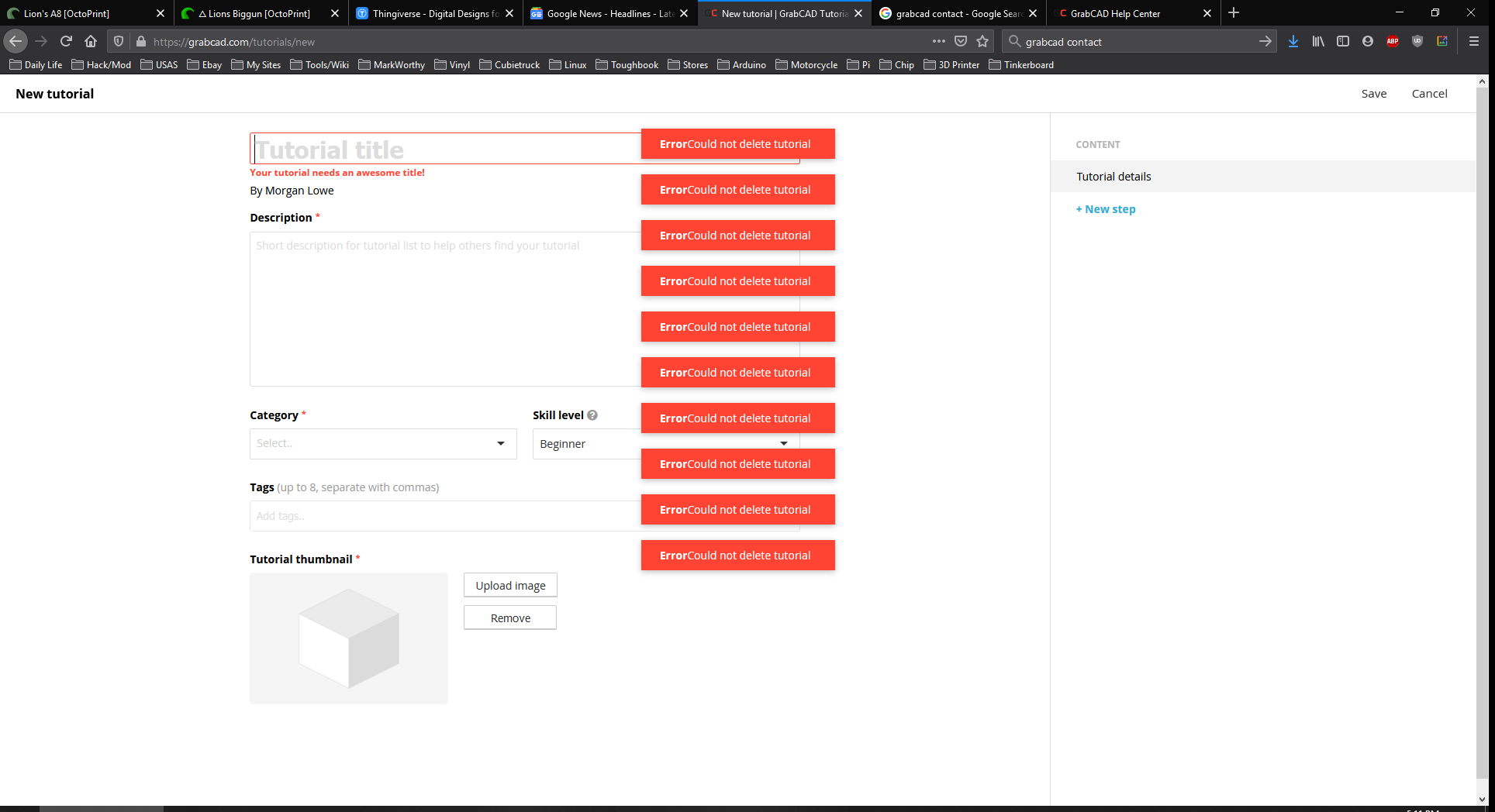 I have had the same problem. Adding a tutorial can be an annoying process. in my view GrabCad should rethink and redesign the whole tutorial module. They should, along with cleaning up the code to fix this bug, look at making tutorials much more useful, the could add a function to enable the attachment of pdf files to a tutorial to enable a hard copy to be printed out for future reference.