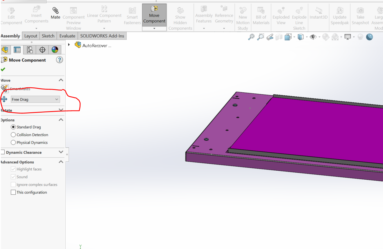 It is difficult (if not impossible) to drag a part designed for translation and free rotation with the mouse w/o rotating it. I've not found it possible to select desired component and move it with the arrow keys. Suggestions for moving an assembly component to achieve translation along the axis only?