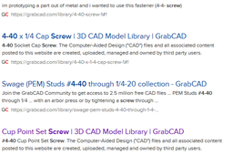Now just looking up 4-40 screw in google is too generic and you'll end up with thousands of useless results, so limit the search to GrabCAD's site only by adding