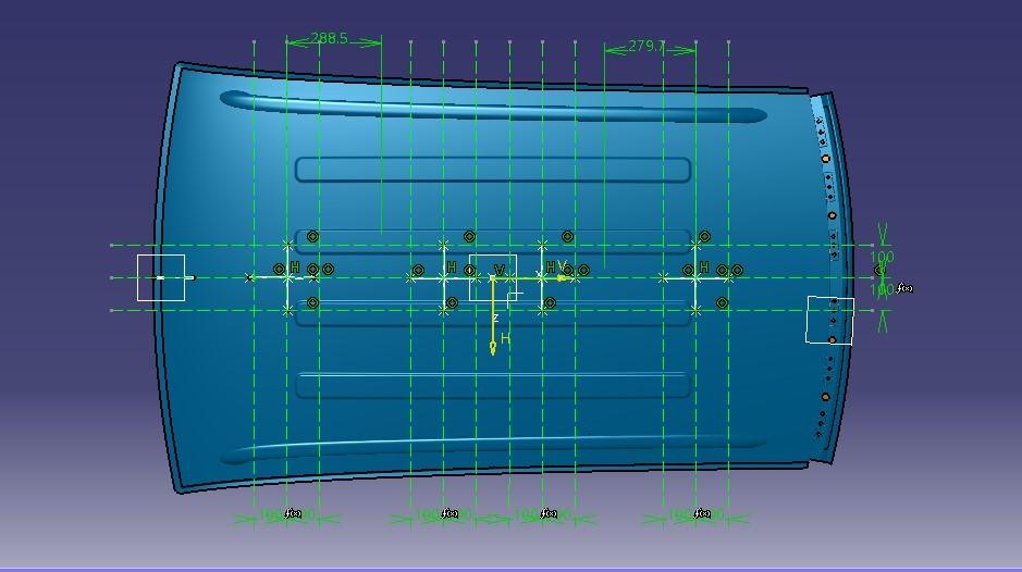 At the 0-Y axis on a perpendicular plane to the roof, as shown in fig. draw 100 mm lines offset to either side of the 0Y axis line. Now center lines are drawn between each adjacent roof rail edge respectively. Intersection points are marked on the sketch and exit the sketch. Make all geometry in construction lines except the points.