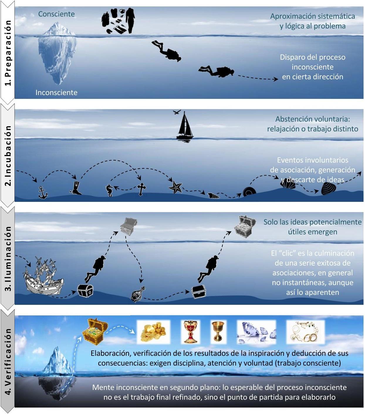 Busse & Mansfield (p. 51) cite the theory of Jacques Hadamard (The psychology of invention in the mathematical field, 1945) as an evolution of that of Graham Wallas (The art of thought, 1926) combining previous theories and with emphasis on association of ideas. It illustrates the idea of the “iceberg” that Freud associated with the conscious, preconscious and unconscious levels of the mind.
