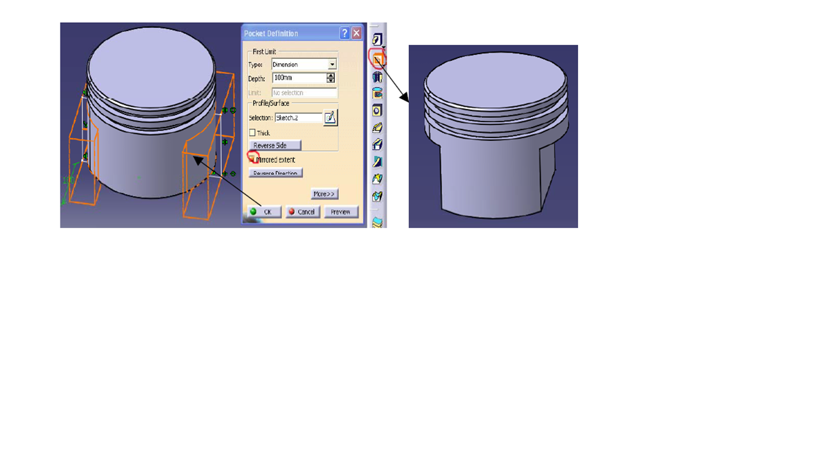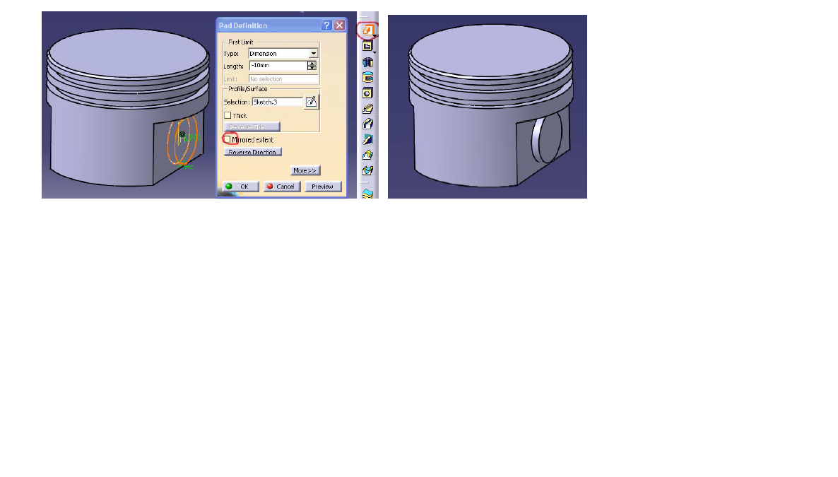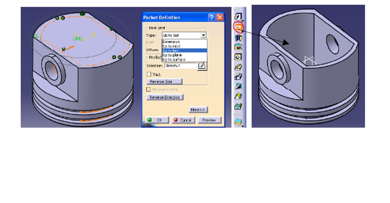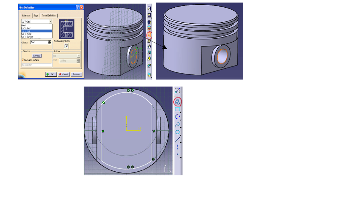 Using the Profile icon, create the geometry on the bottom surface of the piston.