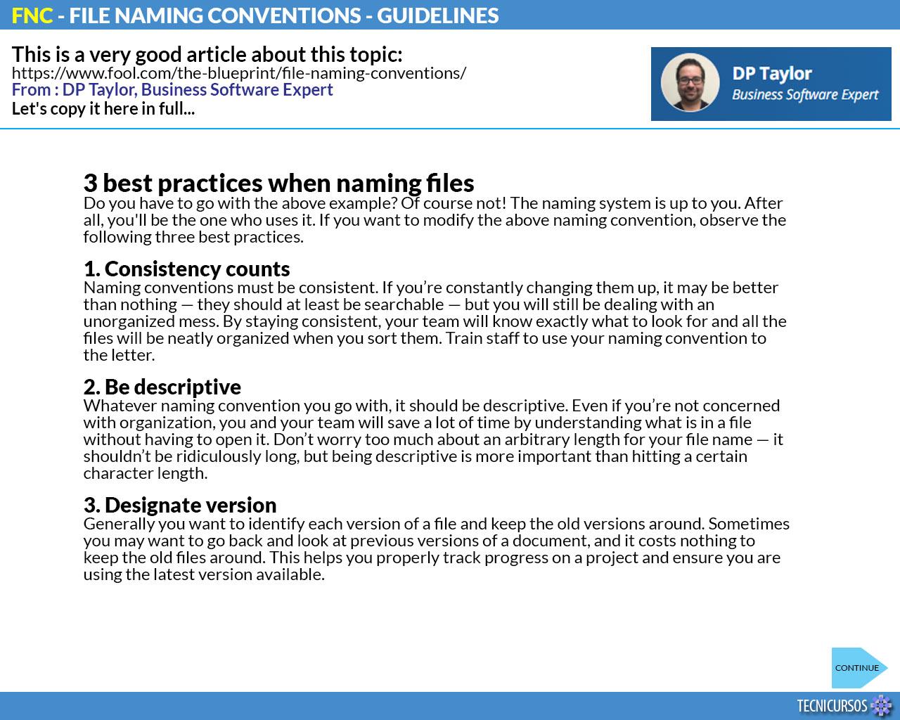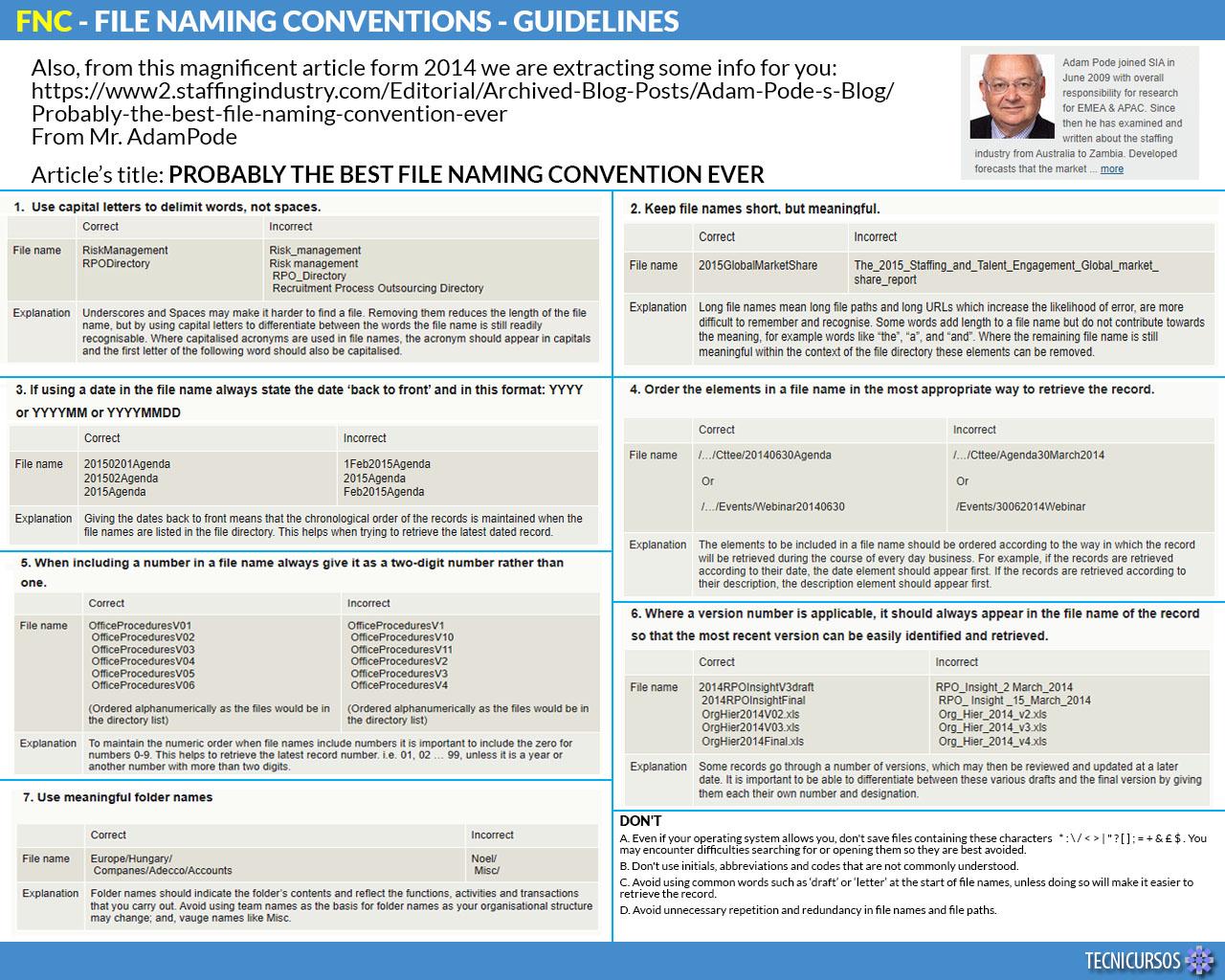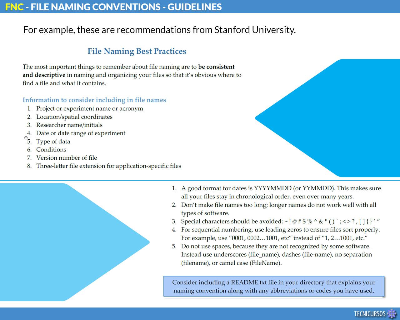 These are some important practical recommendations, issued by renowned experts and universities, regarding the need to have a fair, useful, practical and effective File Naming Convention (FNC).