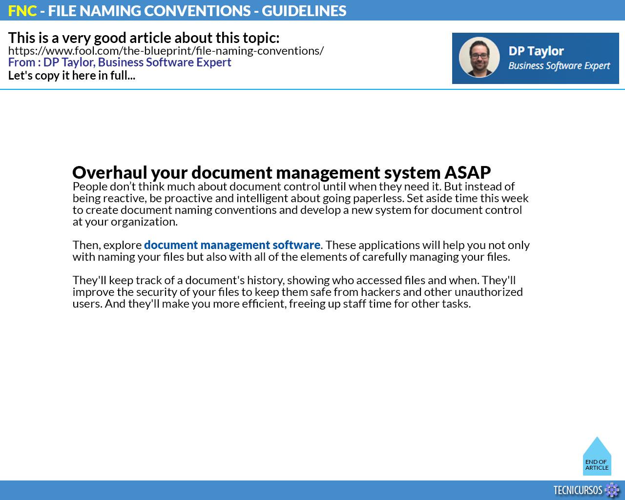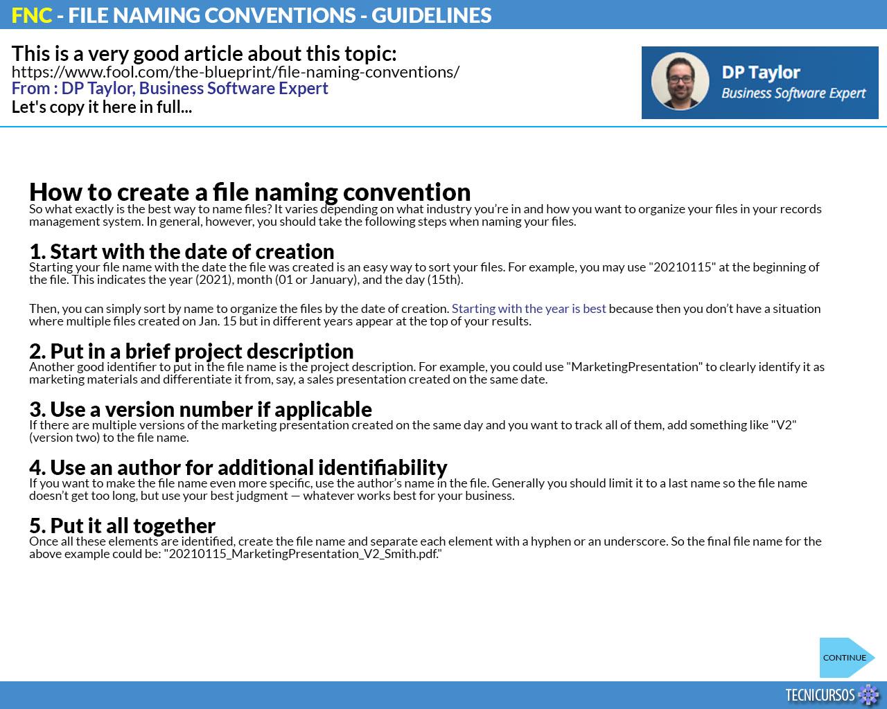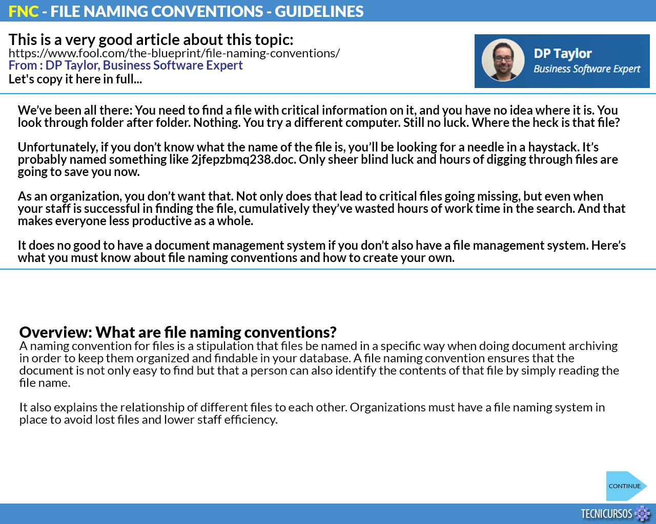 These are some important practical recommendations, issued by renowned experts and universities, regarding the need to have a fair, useful, practical and effective File Naming Convention (FNC).