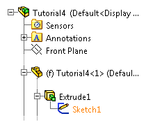 ➝ In the feature tree, locate Sketch1 on the Extrude1 feature in the Tutorial4 component.