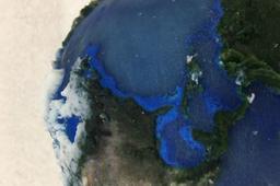 何度か造形テストを行う必要があったので、材料節約のため、地球のモデルは縮小サイズで造形しました。一般に新規のモデルを作成するにあたっては、縮小したサイズで造形するやり方が有効です。透明部分を含む3分の1サイズの初回の造形では、少々サンドペーパーで磨くことで海の外観が良くなりました。