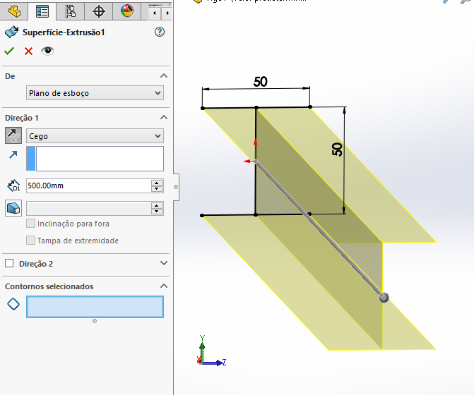Nesse passo iremos realizar a extrusão do nosso esboço desenhado no Step 1. Para realizar isso você deve fechar o esboço e na aba superfícies, utilizar o recurso "Superfície Extrudada".