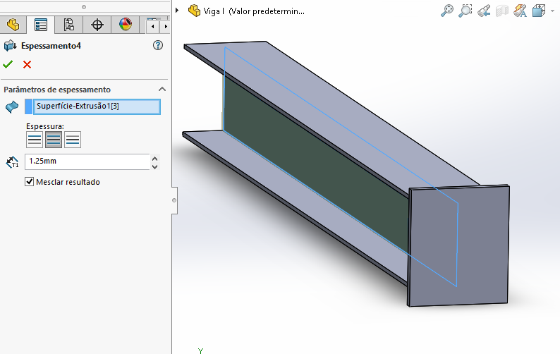 Nessa parte iremos definir as espessuras das nossas superfícies, utilizando o recurso espessar superfícies. Iremos colocar a espessura para ambos os lados e setar o valor de 1.25mm.