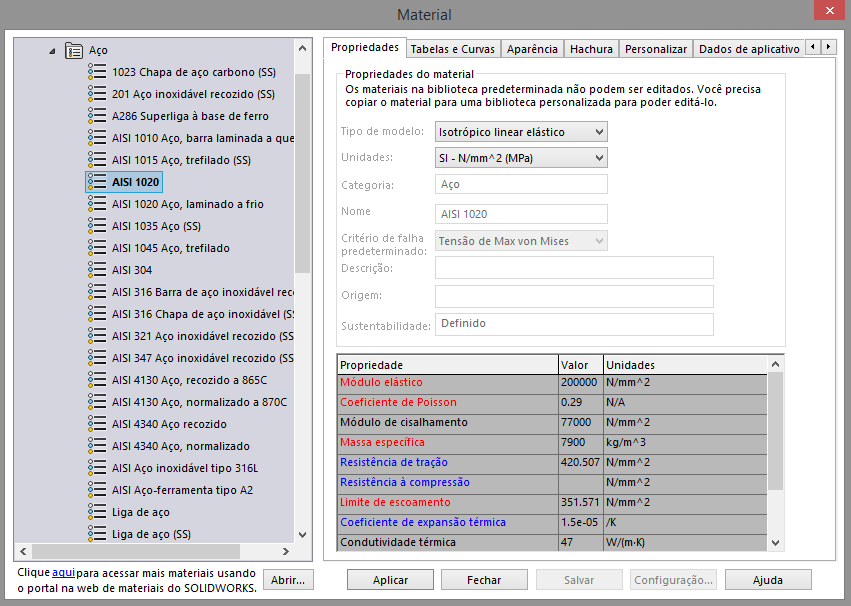 No meu exemplo adicionei o Aço 1020, a única exigência para escolha do material que não dê erro na simulação é avaliar as propriedades que se encontram em vermelho quando abre a janela do material, o material deve ter as propriedades vermelhas definidas.