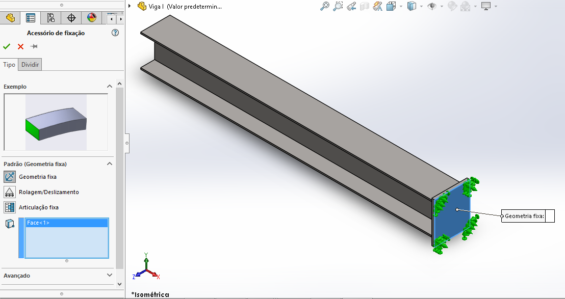 Após definido o material, iremos adicionar o acessório de fixação, no nosso exemplo usaremos a Geometria Fixa, que representa uma viga engastada.