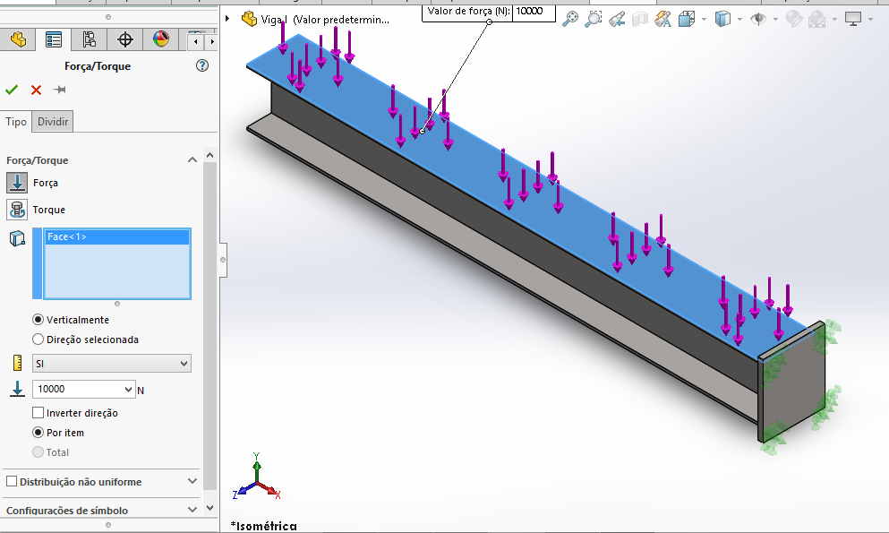 Nesse item iremos selecionar uma força e também a face a qual será aplicada essa força, conforme a imagem a seguir: