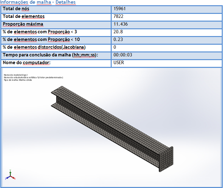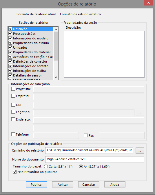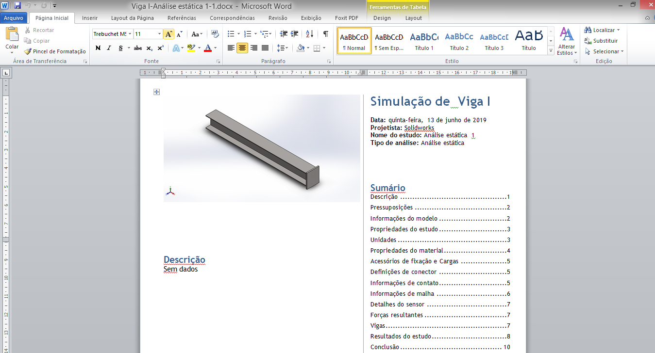 Após selecionar a opção "Publicar" o software irá gerar o arquivo .docx com os dados da sua simulação (Propriedades do material, dimensões da peça, malha, resultados da simulação...)