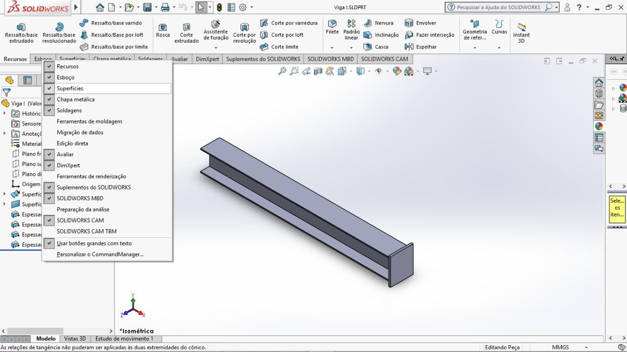 Utilizaremos a aba de Modelagens por superfícies, por isso é necessário verificar se a mesma está ativada, caso não esteja você deve pressionar o botão direito sobre a aba dos demais recursos "Recurso/esboço/Suplementos do SolidWorks".