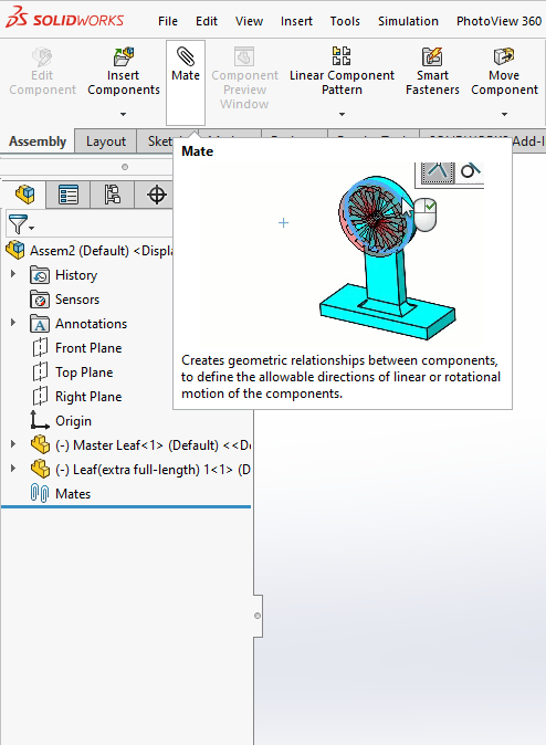 - Use the Mate tool to align the additional leaves with the main leaf.