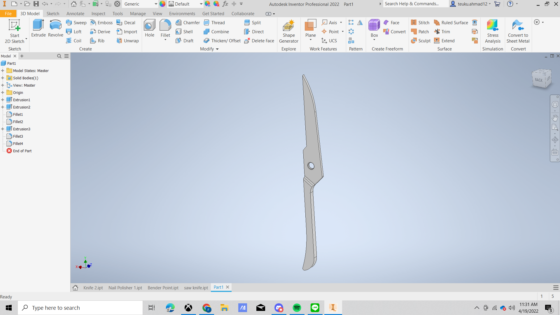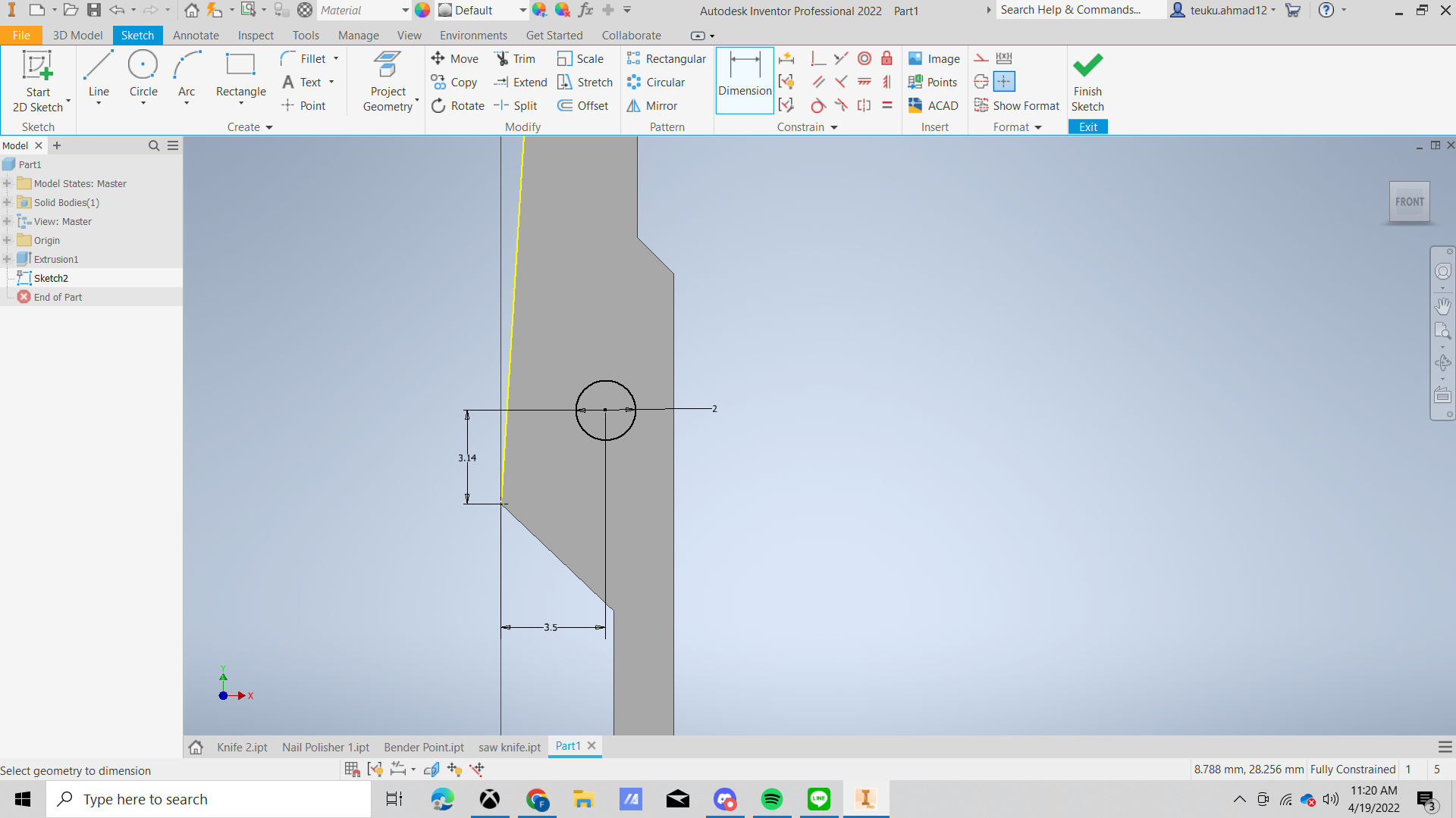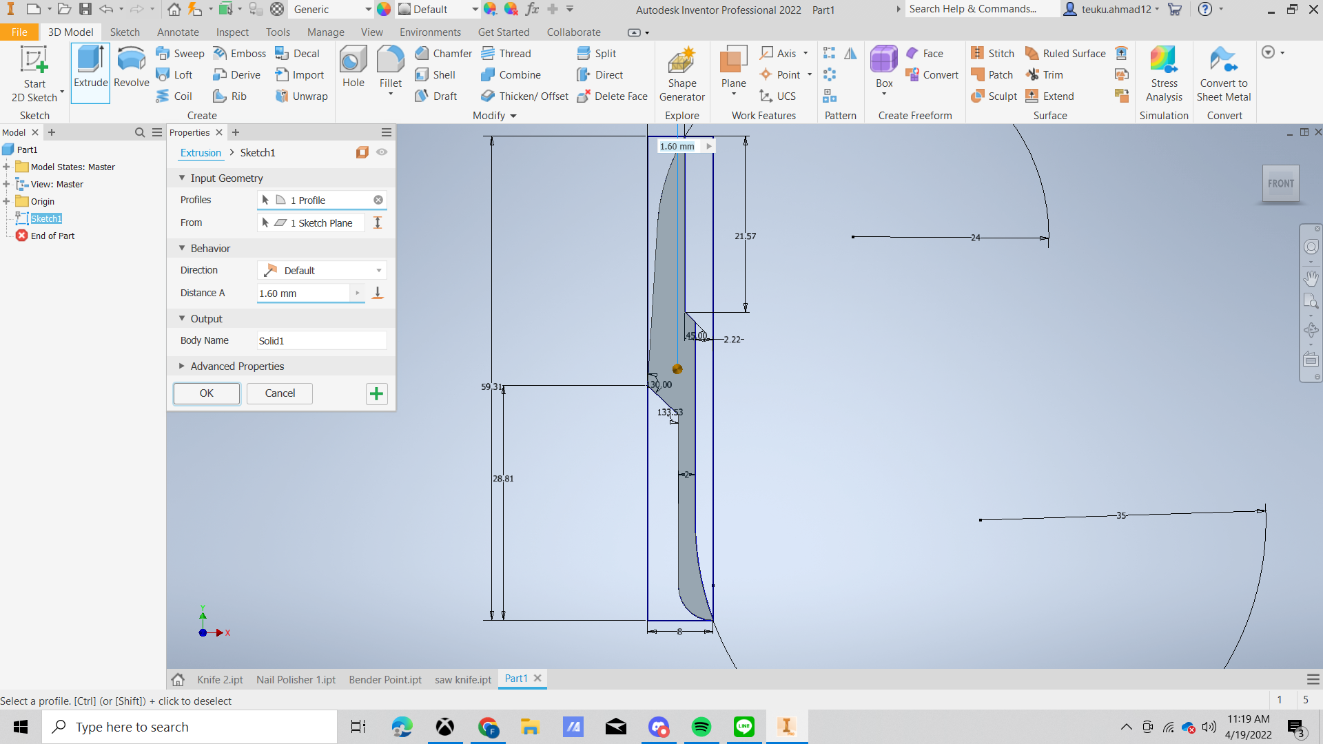 Make a rectangle with height 59.3 mm and the width 8 mm. after that make sketch of scissor like in the picture. draw the line from the bottom make a little curve and the draw a straight line and make corner with angle 133.53 degree and after that draw a straight line again with the end make a little curve with radius 24 mm and the make a straight line to the bottom with length 21.57 mm and make a corner with angle 45 degree and make straight line again with the end make a little curve with radius 35 mm.