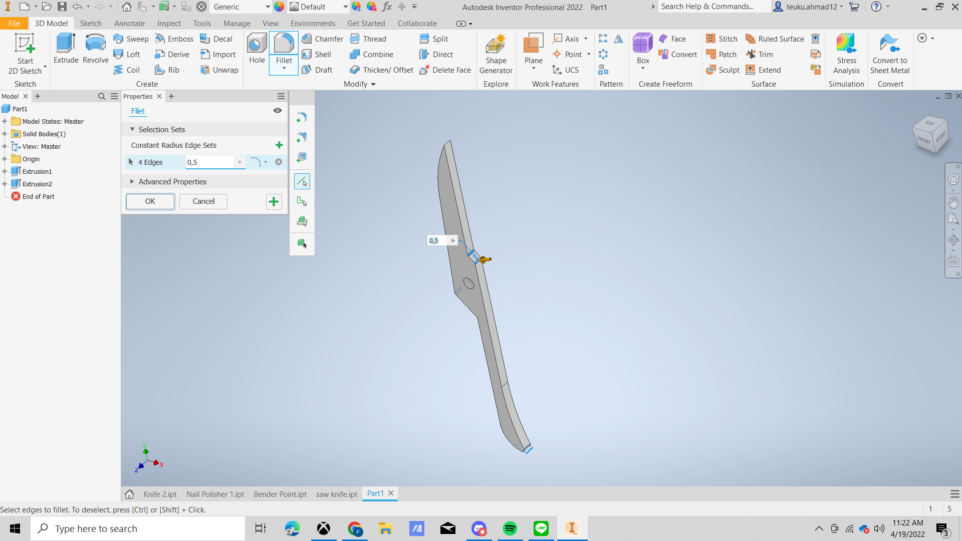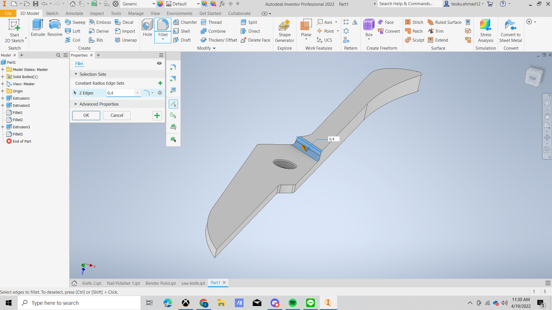 FIllet the edge with the radius edge is 0,4 mm