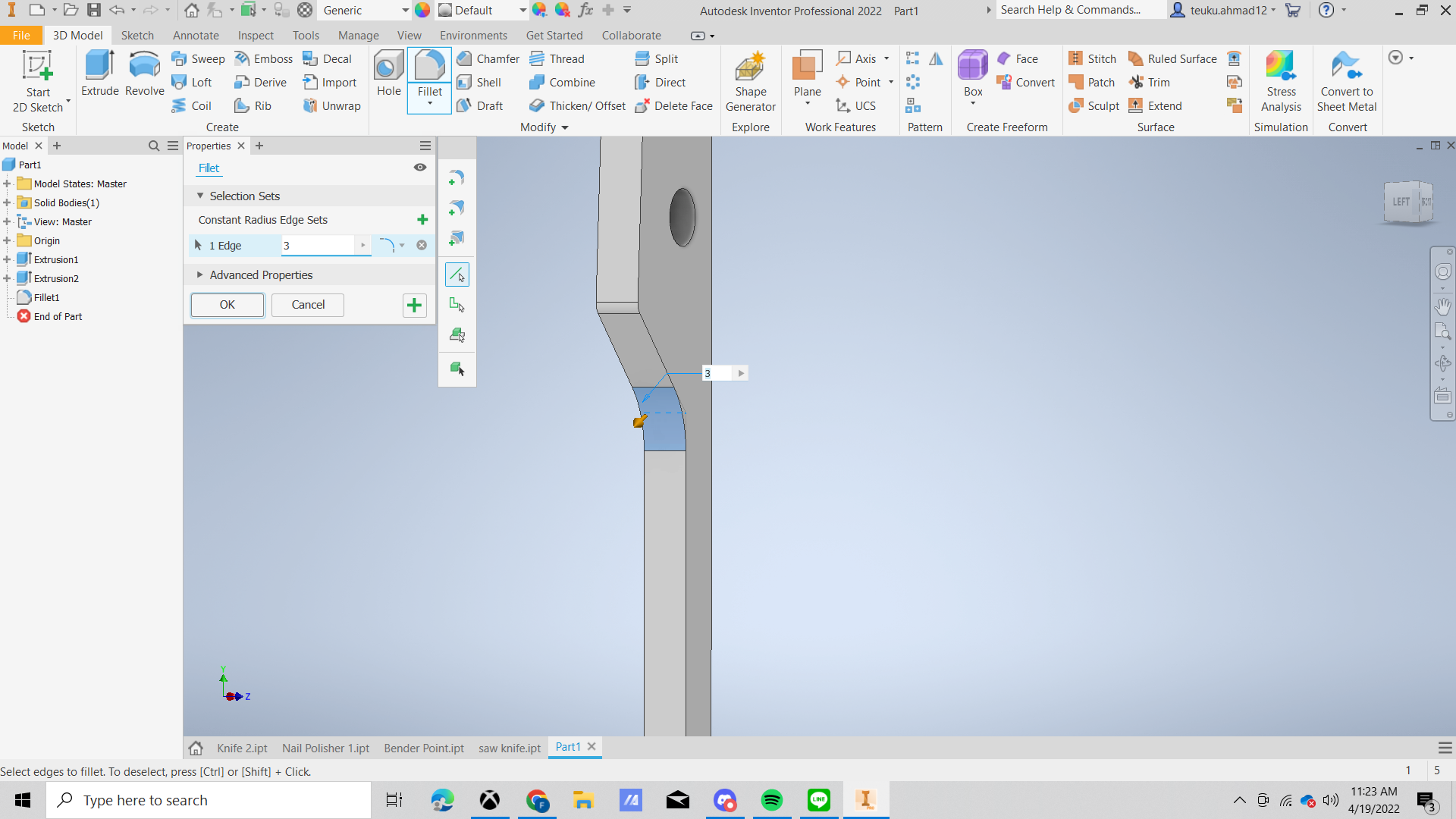 Fillet the edge like in the shown in the picture. in the picture 1 the radius edge is 0,5 mm and the second picture is 3 mm