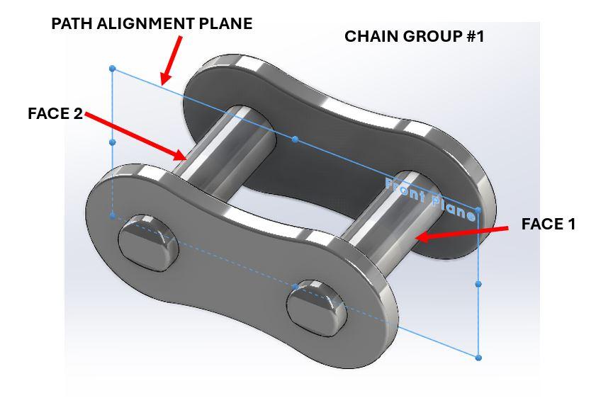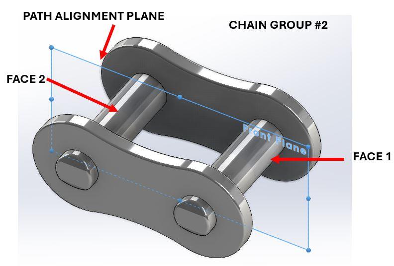 - Path Alignment plane: A plane perpendicular to our connection elements, in this case, using the front plane of the chain link, as it passes through its center.