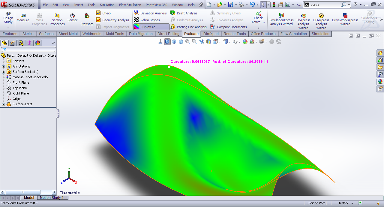 Now click on the surface to see the radius of curvature. As we can see that the radius of curvature is 24.239 so the reciprocal radius i.e. curvature is 0.0411. The green color shows less radius of curvature and blue area shows high radius of curvature.