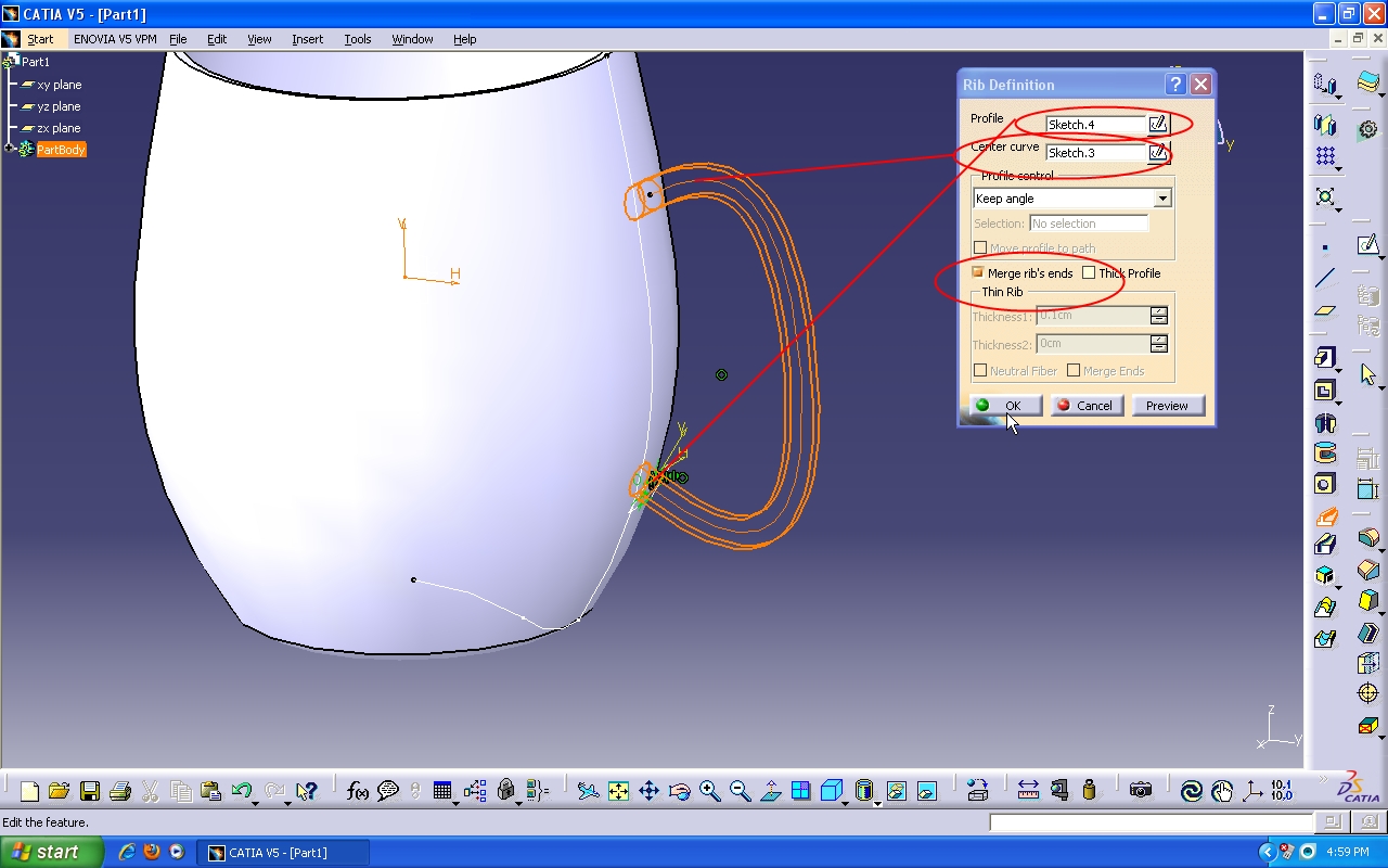Select the profile as made in step 5, center curve as the spline and check "merge rib" option.