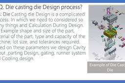 Ans: Die Casting die Design is a complicated process. In which we need to considered so many things and Calculation During Design. For Example shape and size of the part, material of the part, type and capacity of the machine, lot size, and tolerances required. Based on these parameters we design Cavity layout ,parting Design, gating, runner system and Cooling design.