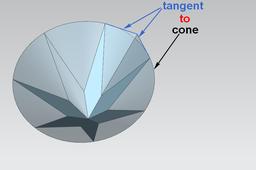 You can specify any angle(cut) fo crystal(brilliant): 1.modify main scetch 2.modify is everyone polygon from scetch 3.modify is angle of rotation(it is curve to the intersection of two surfaces) 4. basic line segments should be tangential to the cone( basic is body of revolution)